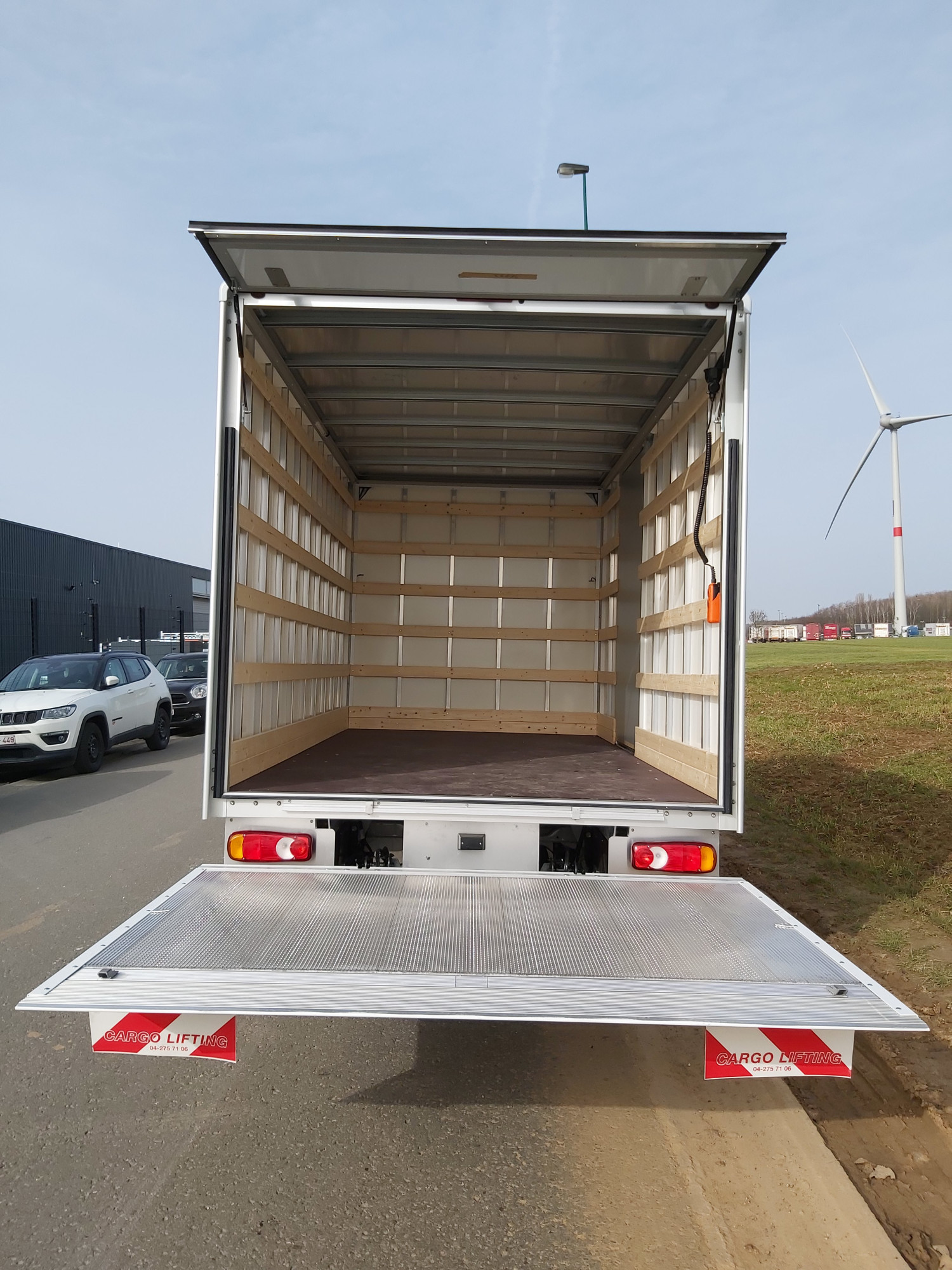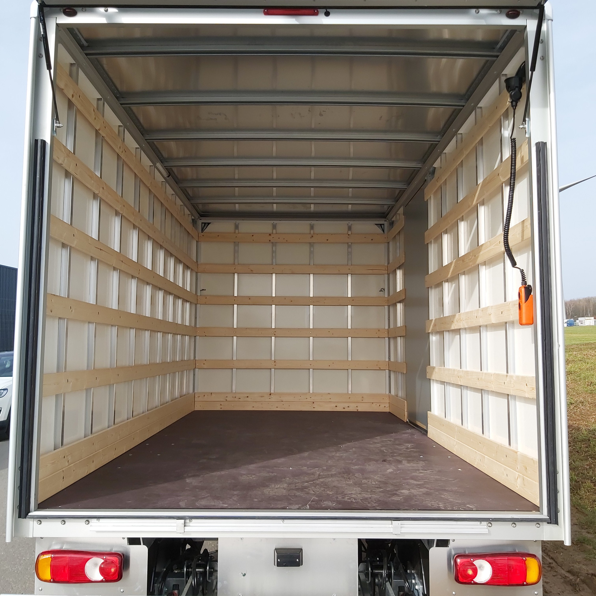 Polyester-Möbelkoffer L4.40xB2.20xH2.40 WEISS - transluzentes Polyesterdach - hintere rechte Flügeltür - hintere Klappe über der Heckklappe - Holzboden 15mm - Latte zu Latte alle 250mm - Innenbeleuchtung LED mit Bewegungssensor - dhollandia Ladebordwand 1800 mm Tragkraft 1. 000 kg - eloxierte Heckklappe, nicht lackiert - Fernbedienung innen mit Spiralkabel und außen unter dem Boden hinten rechts befestigt - Überrollbügel - Sicherheitsbeleuchtung - 3D-Dachspoiler - Zugdeichsel, 1-reihig an 3 Wänden (Höhe 800 mm) - Anhängekupplung 13-polig (max.3,5 T-Zugkraft (Führerschein B/E)) - Einparkhilfesystem mit Kamera